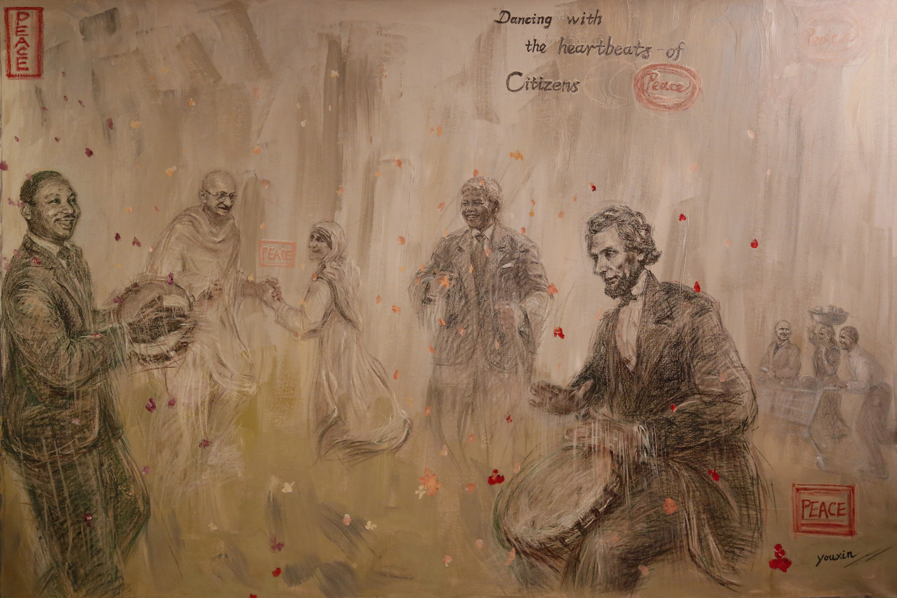 Youxin Yang, Peace-VII: Dancing with the Heartbeats of Citizens, Oil pastel, acrylic, and Chinese watercolor on canvas, 68” x 98,” 2018, (Digital Print Version) |